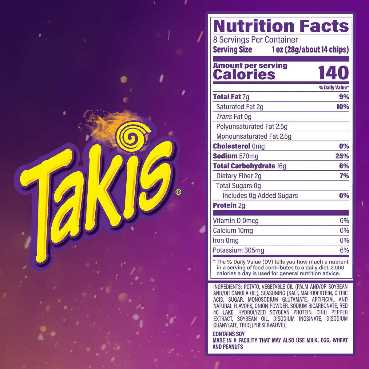 Takis kettle-style rolled tortilla chips offer a thicker, crunchier texture with bold seasoning. This 8 oz bag is a convenient shareable size, ideal for snacking at home, gatherings, or stocking your pantry.