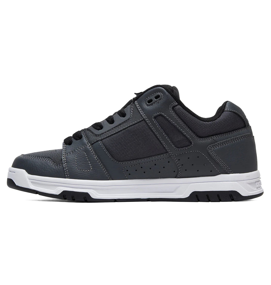The DC Stag (Model 320188) is a modern classic in the world of skate footwear, evolving the traditional "puffy" silhouette with a more technical, multi-layered design. Engineered for both performance and style, the Stag offers exceptional durability, superior comfort, and a distinctive look that sets it apart. The 072 Dark Gray colorway presents a sleek, monochromatic aesthetic that is both versatile and tough, highlighting the shoe's intricate construction.