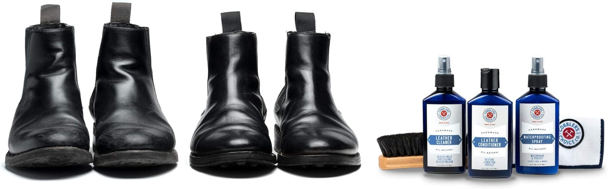 The Essential Leather Kit by Cobbler's Choice is a complete, all-natural care set for cleaning, conditioning, and protecting leather goods. Made in the USA, it provides everything you need to maintain the longevity and appearance of your favorite leather shoes, boots, jackets, and more.