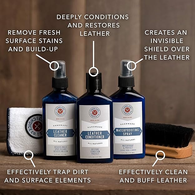 - Leather Cleaner: A 6 oz, all-natural, phosphate-free formula designed to remove dirt, surface stains, and buildup. It contains tea tree oil for a long-lasting cleaning effect and to prevent mold and mildew.