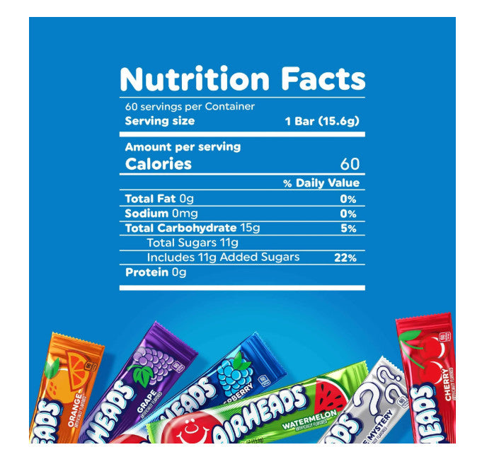 Airheads Chewy Candy Bars, Assorted Flavors, Nut Free 33 oz, 60 Count Box